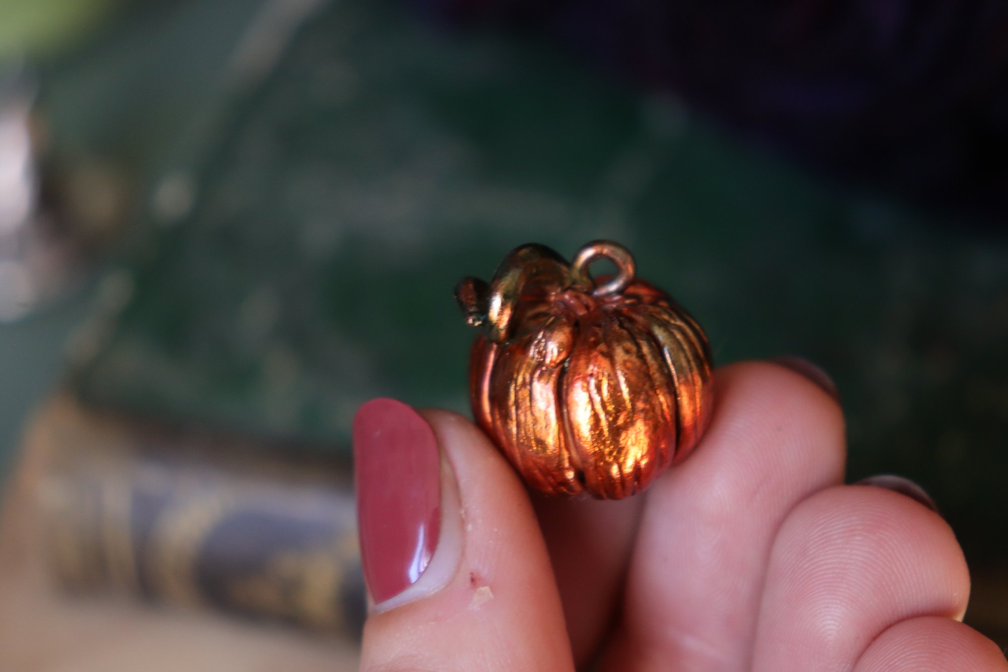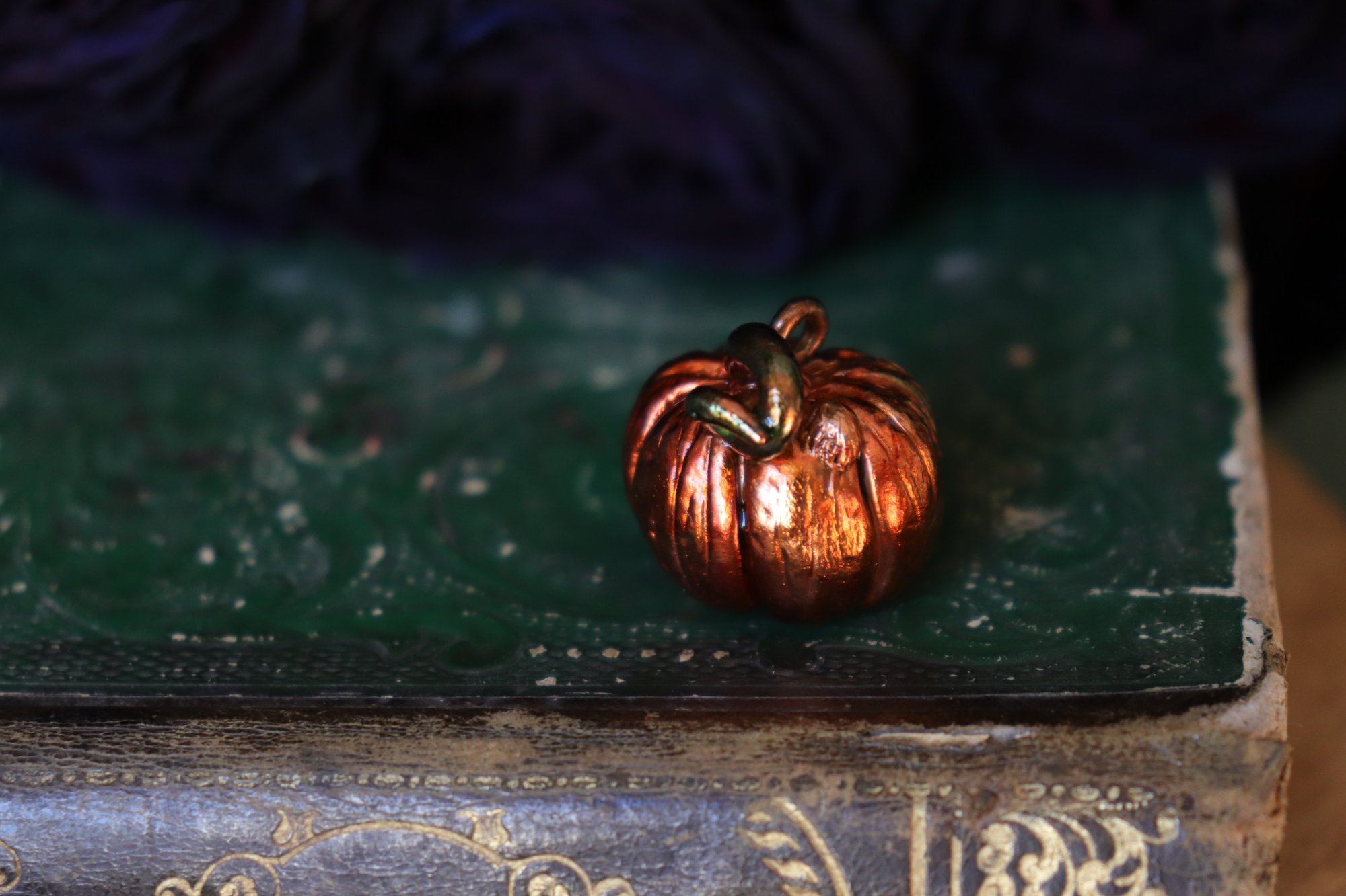 Questo gioiello con piccola zucchetta, d'ispirazione autunnale, è stato modellato interamente a mano e poi rivestito in rame.